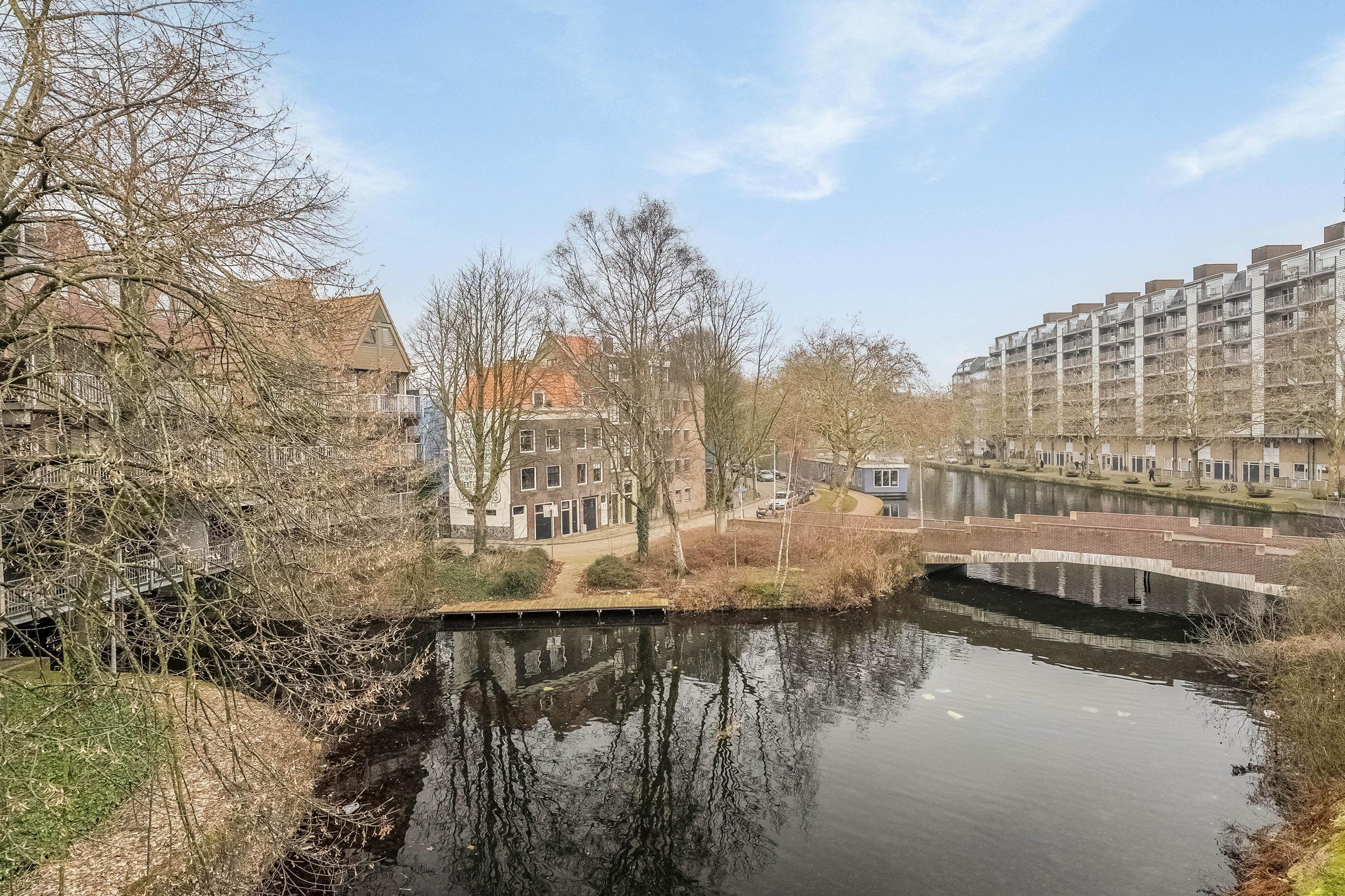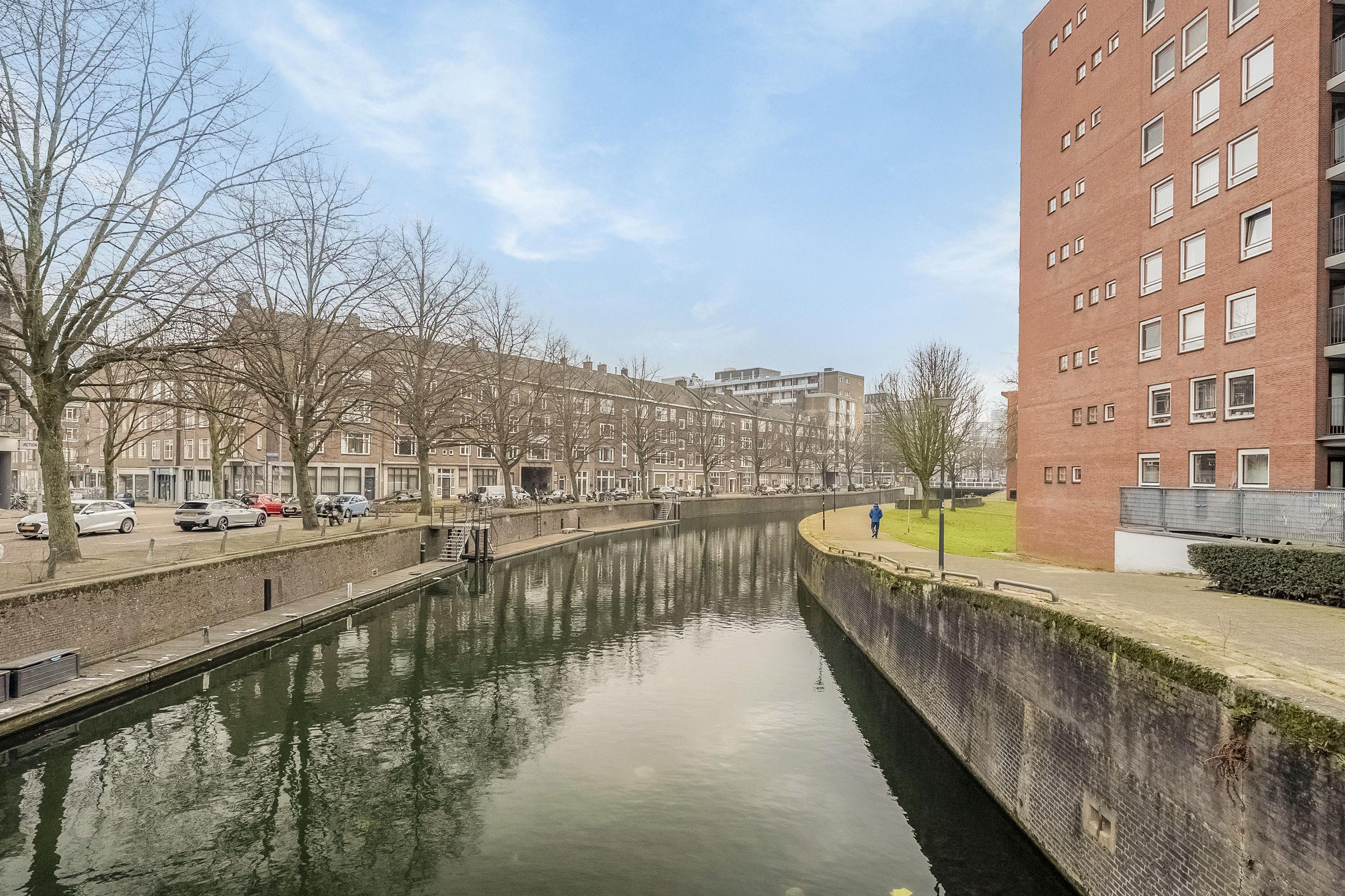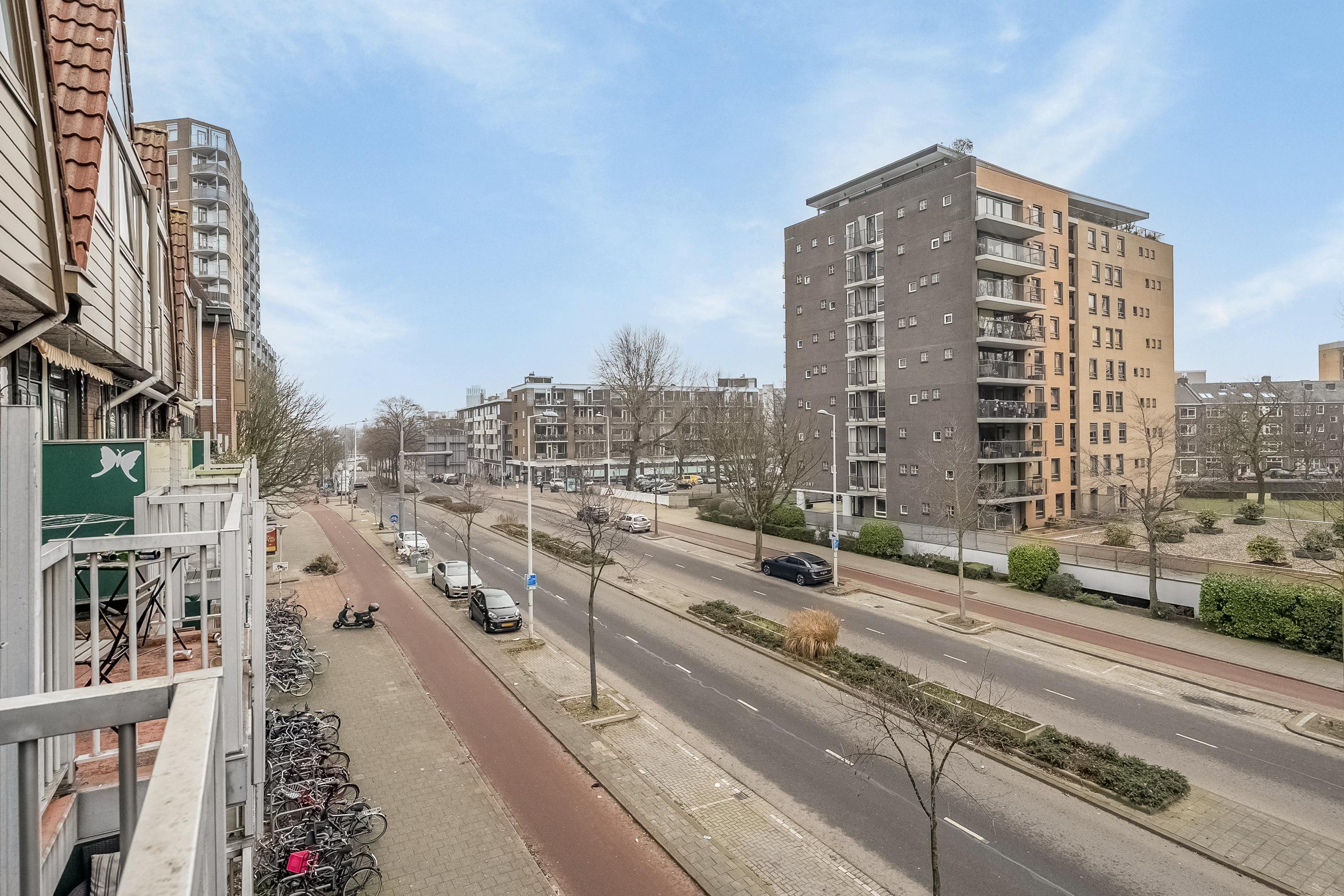 Vanuit de woonkamer kan je aan de voorzijde via 2 deuren het balkon op. Het balkon is lekker ruim (8m2) en vrij diep waardoor je eenvoudig een eettafel of loungeset kwijt kunt. Je zit op het zuid-oosten, heerlijk op de zon. Vanaf het balkon kijk je zo op de Lombardkade.