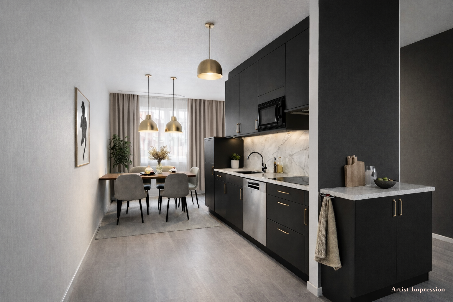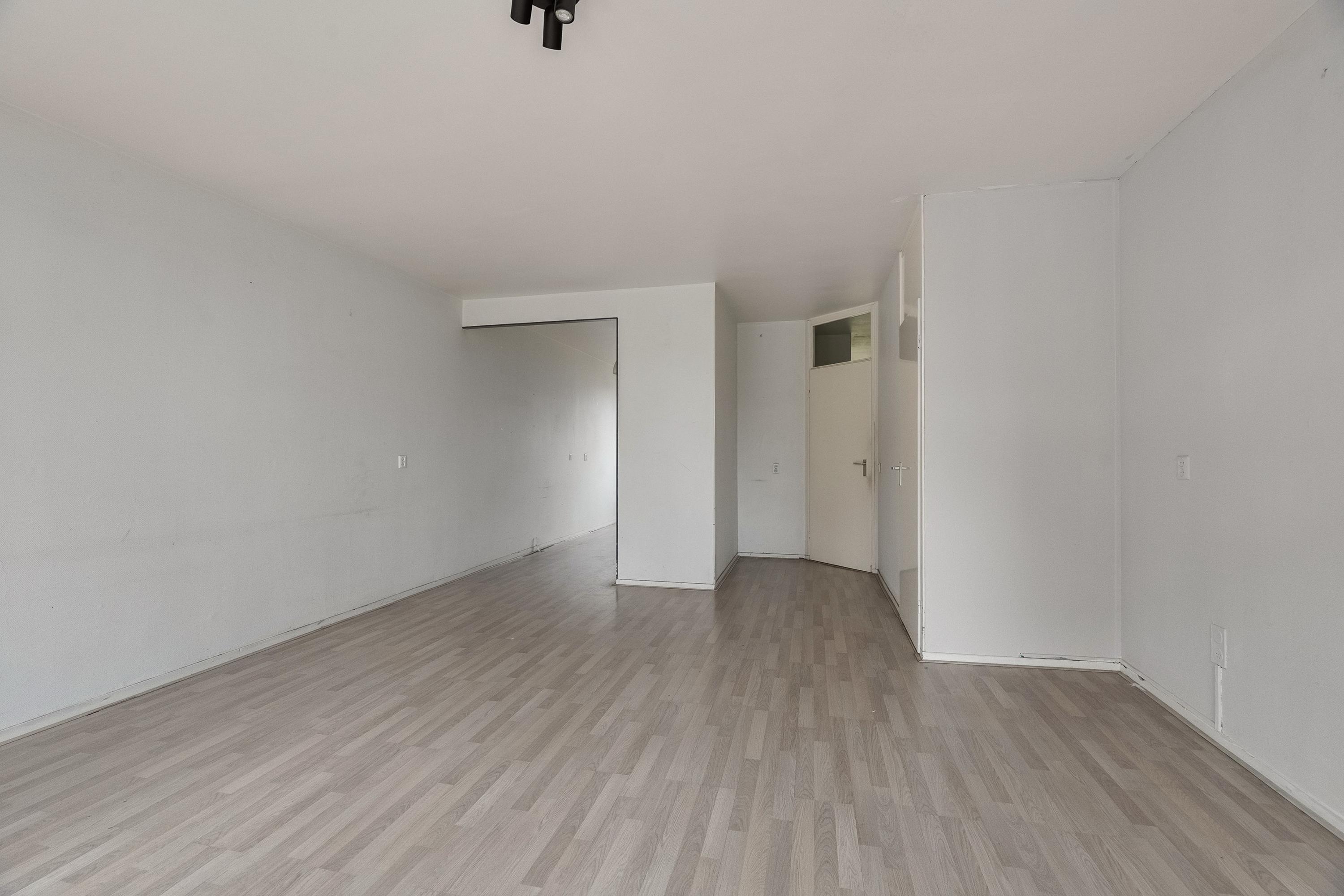Via de galerij stappen we achter de voordeur de hal binnen, daar treffen we direct rechts een deur die naar de eetkamer & open keuken leidt. Maar we lopen rechtdoor langs het toilet en de meterkast zo de woonkamer in. De woonkamer is heerlijk licht en met 27 m2 lekker ruim. In de woonkamer is ruimte voor een grote zithoek en een extra zitje, de eettafel hoef je er niet kwijt, die kan je kwijt aan de andere kant van de keuken.