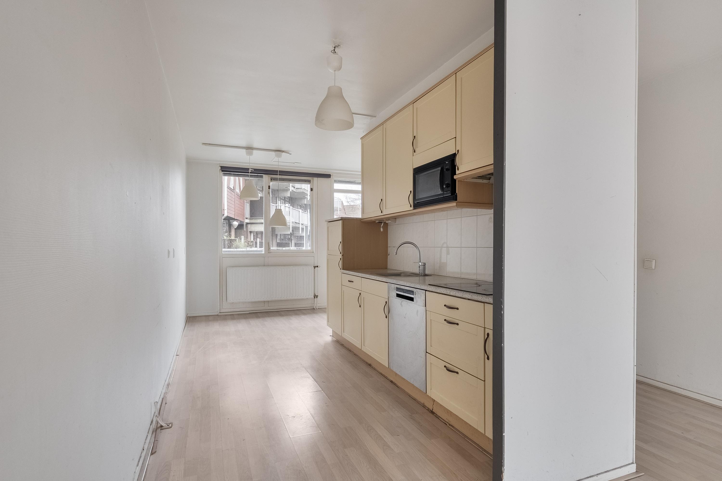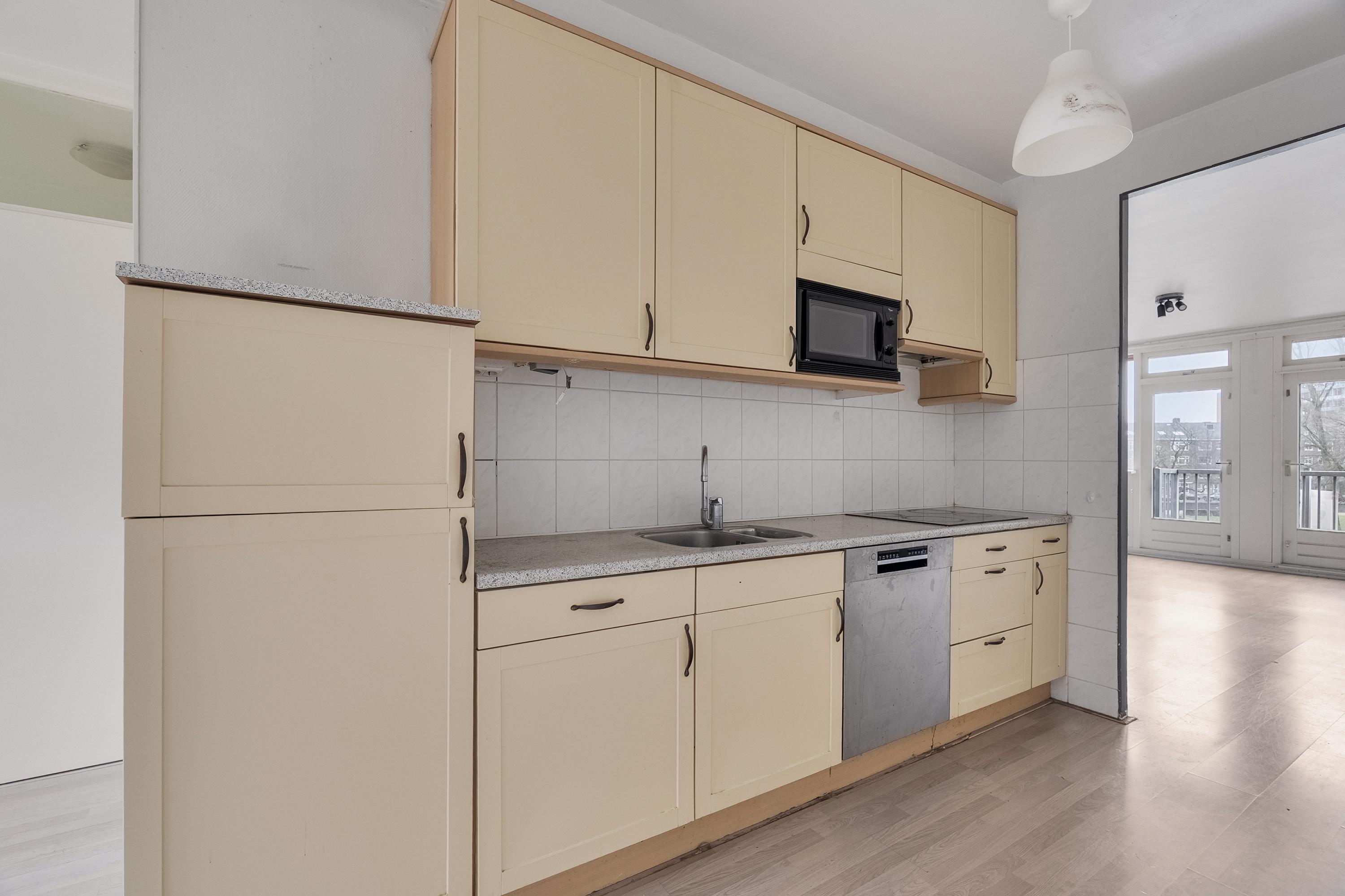 De keuken is voorzien van een ingebouwde vaatwasmachine, magnetron, anderhalve spoelbak en een elektrische kookplaat met afzuigkap erboven. En zoals net al verteld, aan de voorzijde is een hele mooie plek voor een grote eettafel.