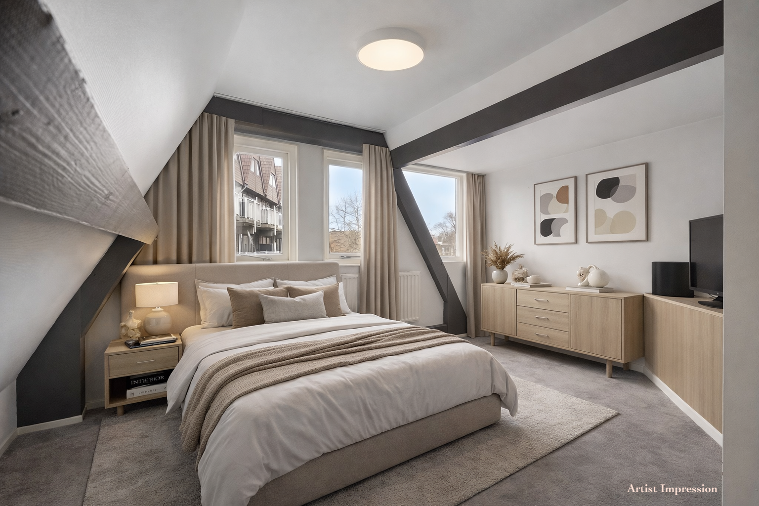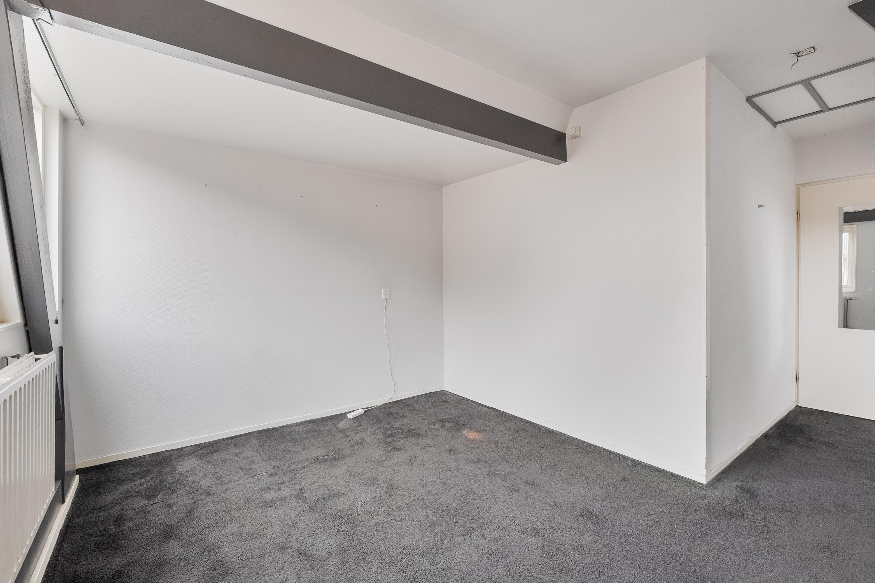 Via de trap lopen we naar boven waar we aankomen op de ruime overloop die toegang geeft tot drie ruime slaapkamers en de badkamer. Een enorm pluspunt van deze woning: alle slaapkamers hebben rechte muren. De meeste bovenwoningen met schuine daken hebben schuine wanden. De kap van dit appartementen is aan beide kanten opgetrokken, dus geen loze hoeken – maar kamers waar moeiteloos een tweepersoonsbed tegen een rechte muur past. Dat is zeldzaam én super praktisch.
