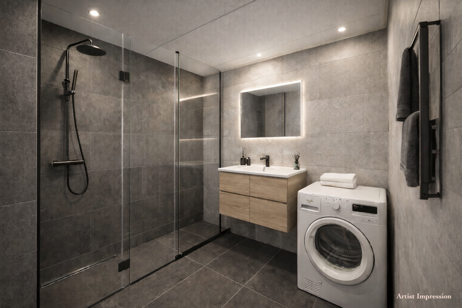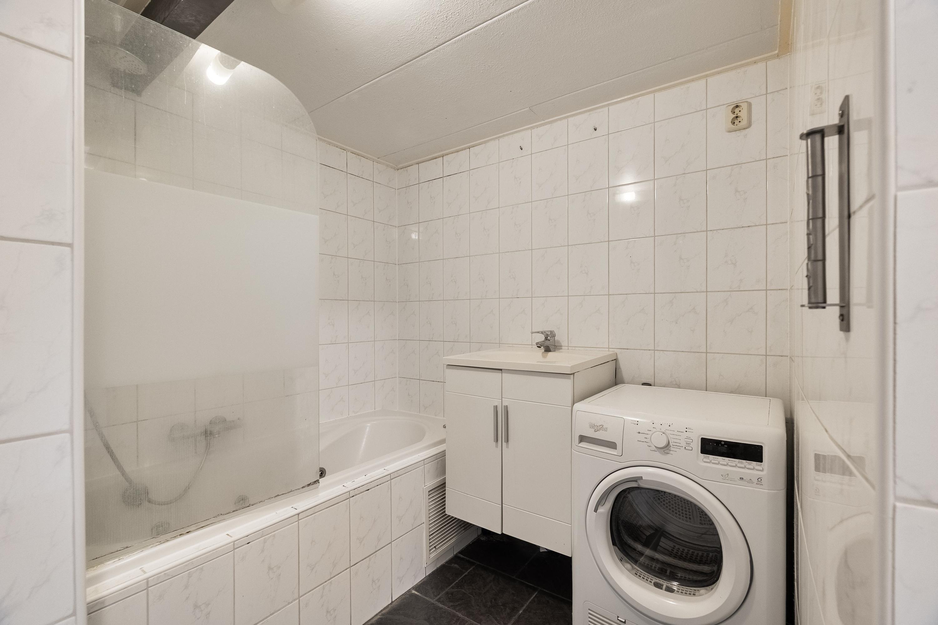 De badkamer is netjes en compleet uitgevoerd met een ligbad/douchecombinatie, wastafelmeubel en aansluiting voor de wasmachine.