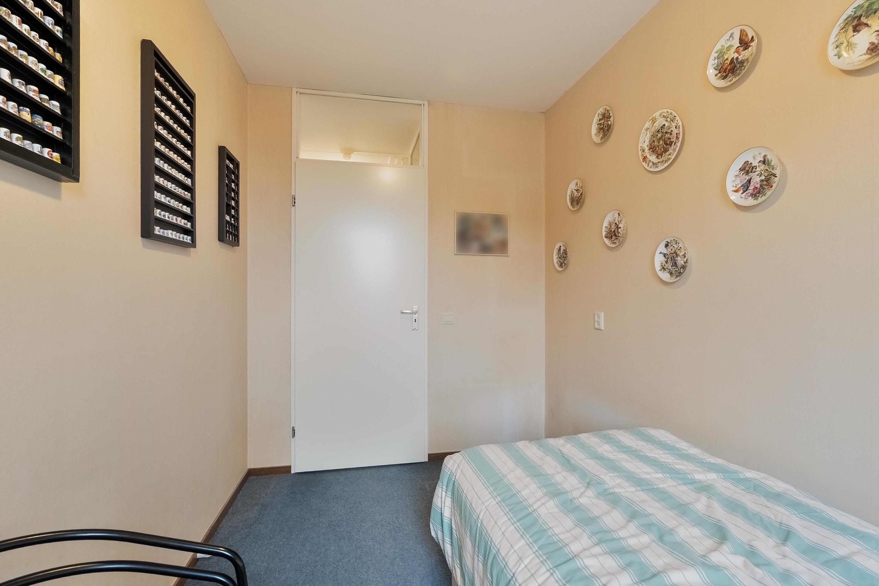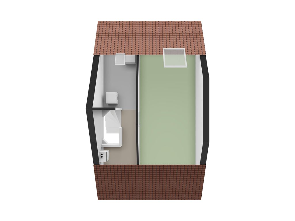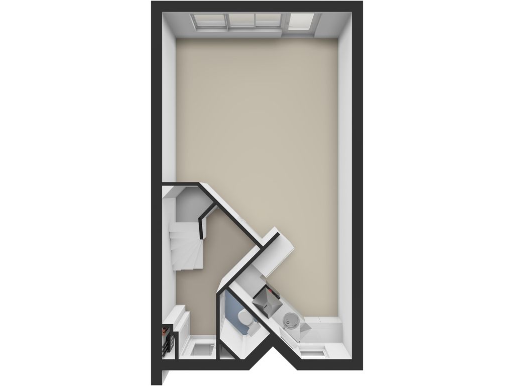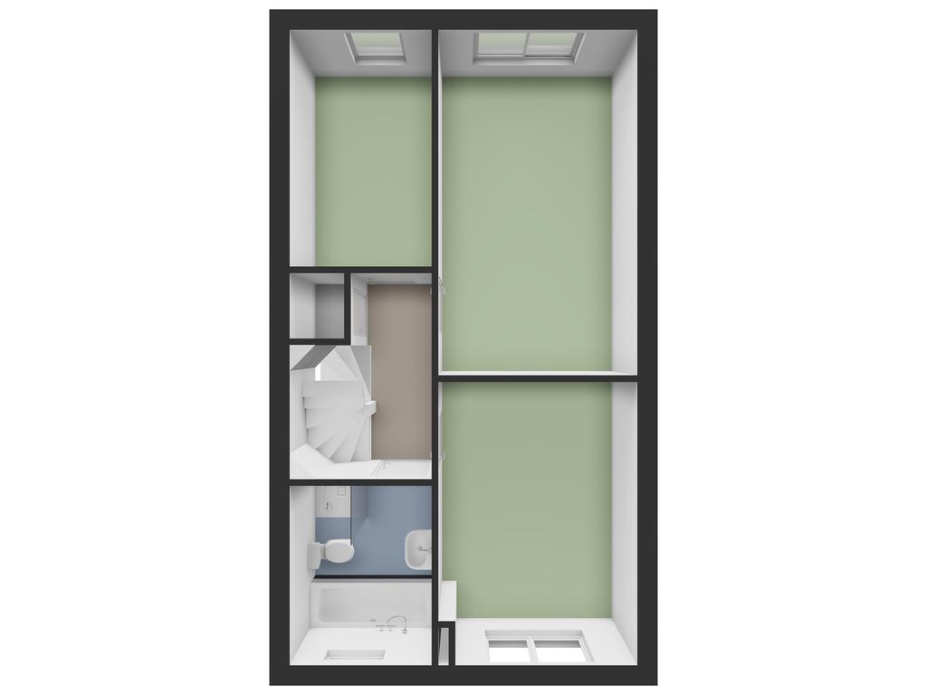 Op deze verdieping bevindt zich de vierde slaapkamer, eveneens voorzien van een dakraam aan de achterzijde. Over de gehele verdieping zijn knieschotten aanwezig, wat zorgt voor veel praktische bergruimte. De vloer is voorzien van vloerbedekking.