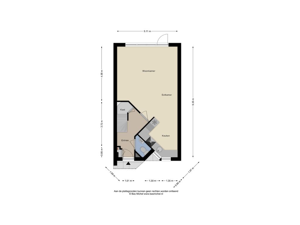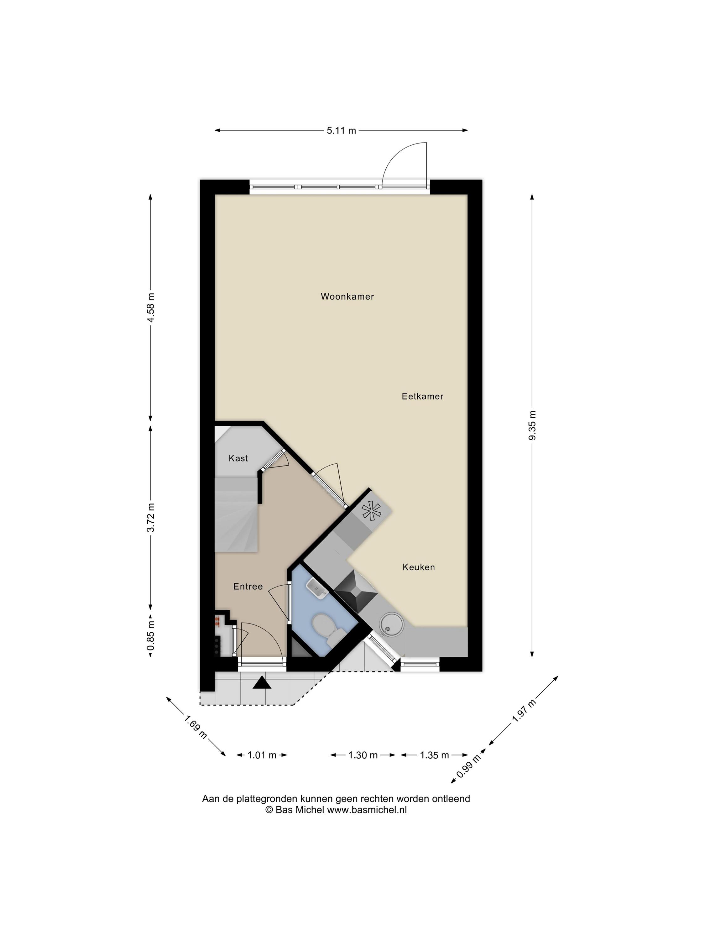 Entree in de hal met meterkast, trapkast en de toiletruimte. Het toilet is voorzien van een duoblok toilet en een fonteintje en is gedeeltelijk betegeld in een lichte kleurstelling. Vanuit de hal leidt de trap naar de eerste verdieping.