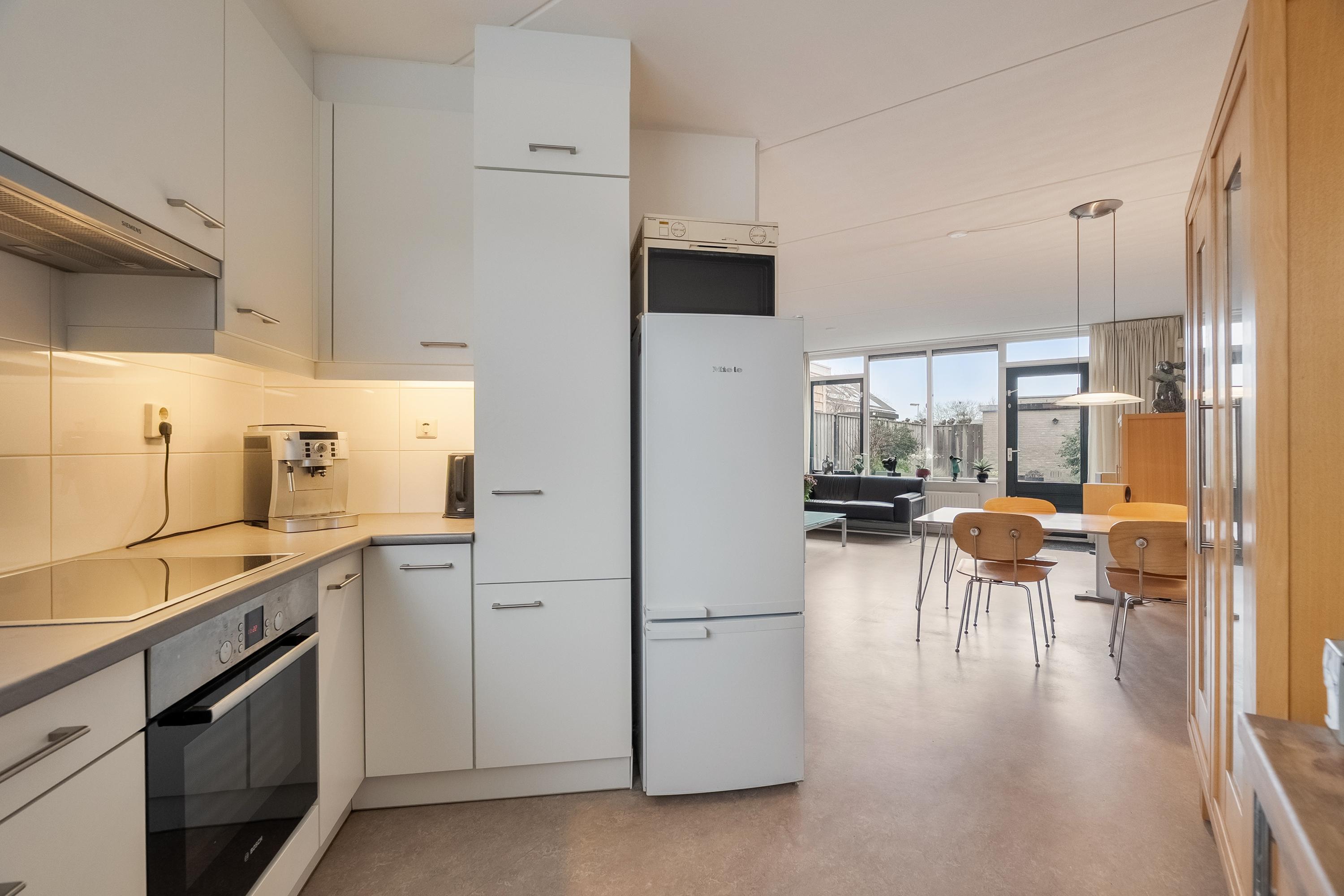 Aan de voorzijde van de woning bevindt zich de halfopen keuken in een praktische U-opstelling. De keuken is uitgevoerd met witte kastjes en een grijs kunststof aanrechtblad en is voorzien van diverse inbouwapparatuur, waaronder een vaatwasser, een 4-pits inductiekookplaat met geïntegreerde afzuiging in het bovenkastje, een oven en een vrijstaande koel-/vriescombinatie.