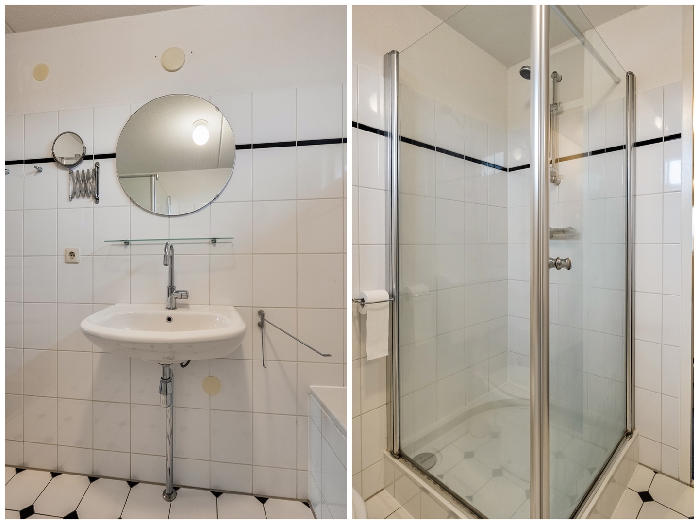 De badkamer is ruim opgezet en voorzien van een ligbad, een aparte douchecabine, een tweede duoblok toilet en een vaste wastafel. De badkamer is gedeeltelijk betegeld in een lichte en tijdloze kleurstelling.