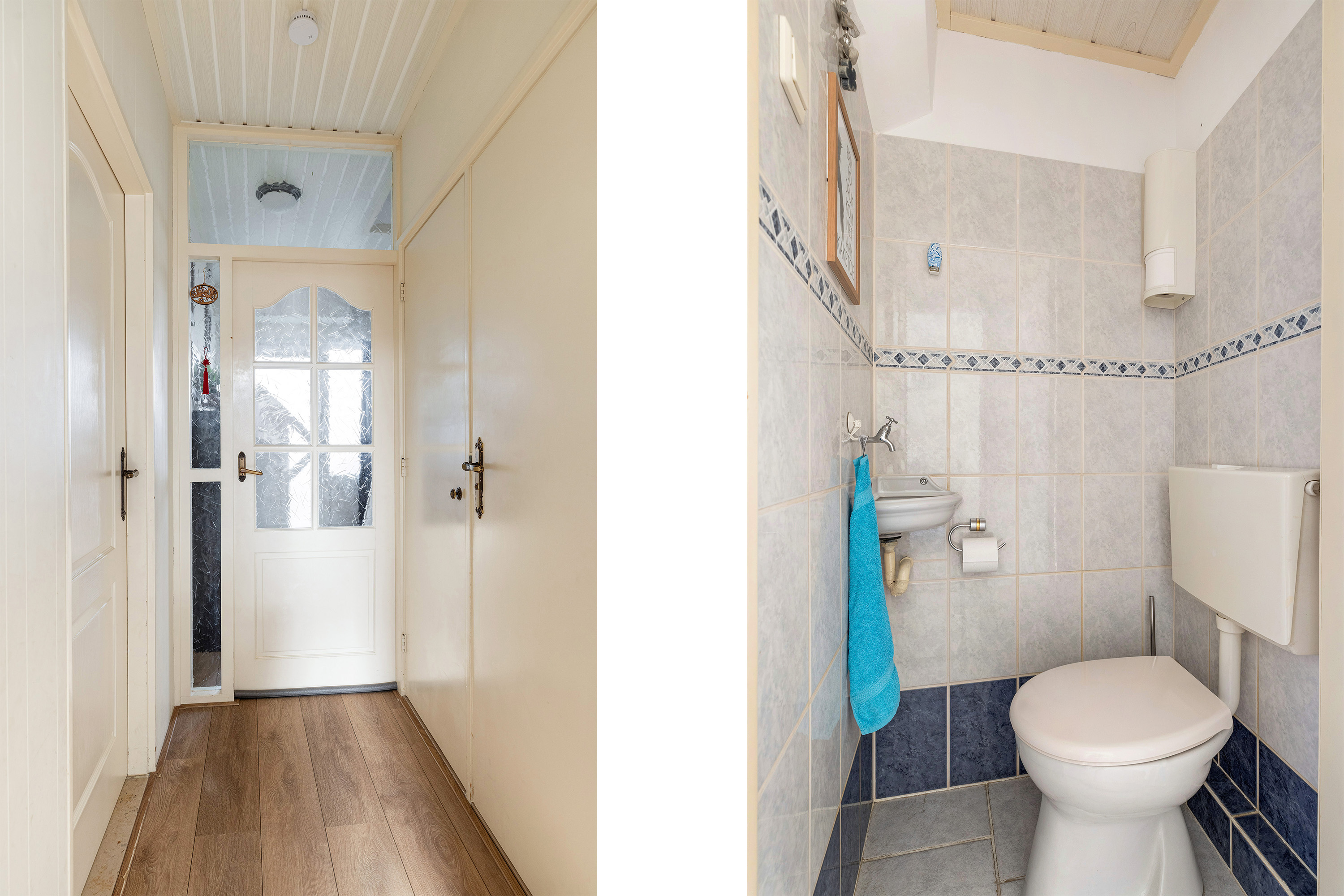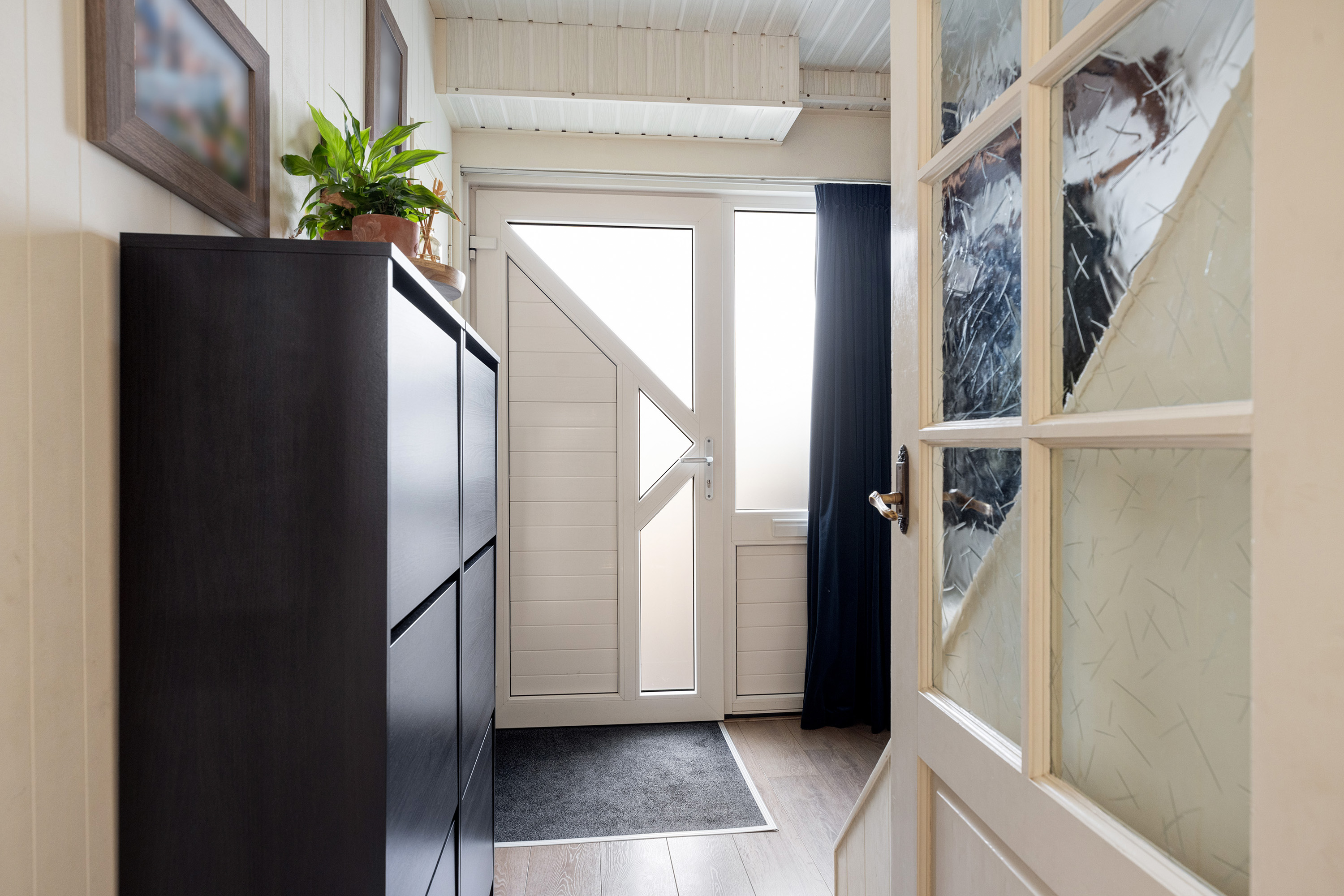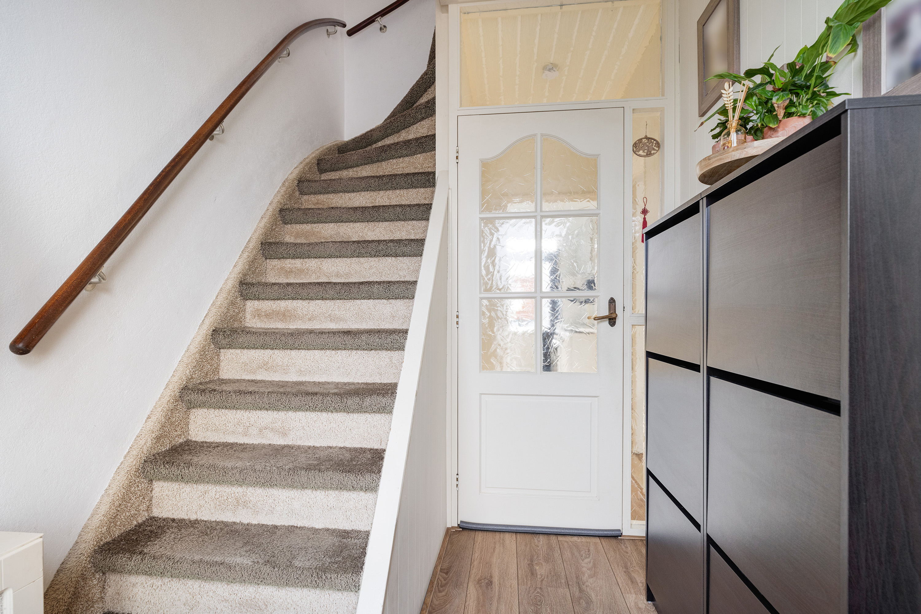 Entree in het voorportaal met trapopgang naar de eerste verdieping en de meterkast. Via een deur bereikt u de tussenhal met trapkast en toegang tot zowel de woonkamer als de keuken.