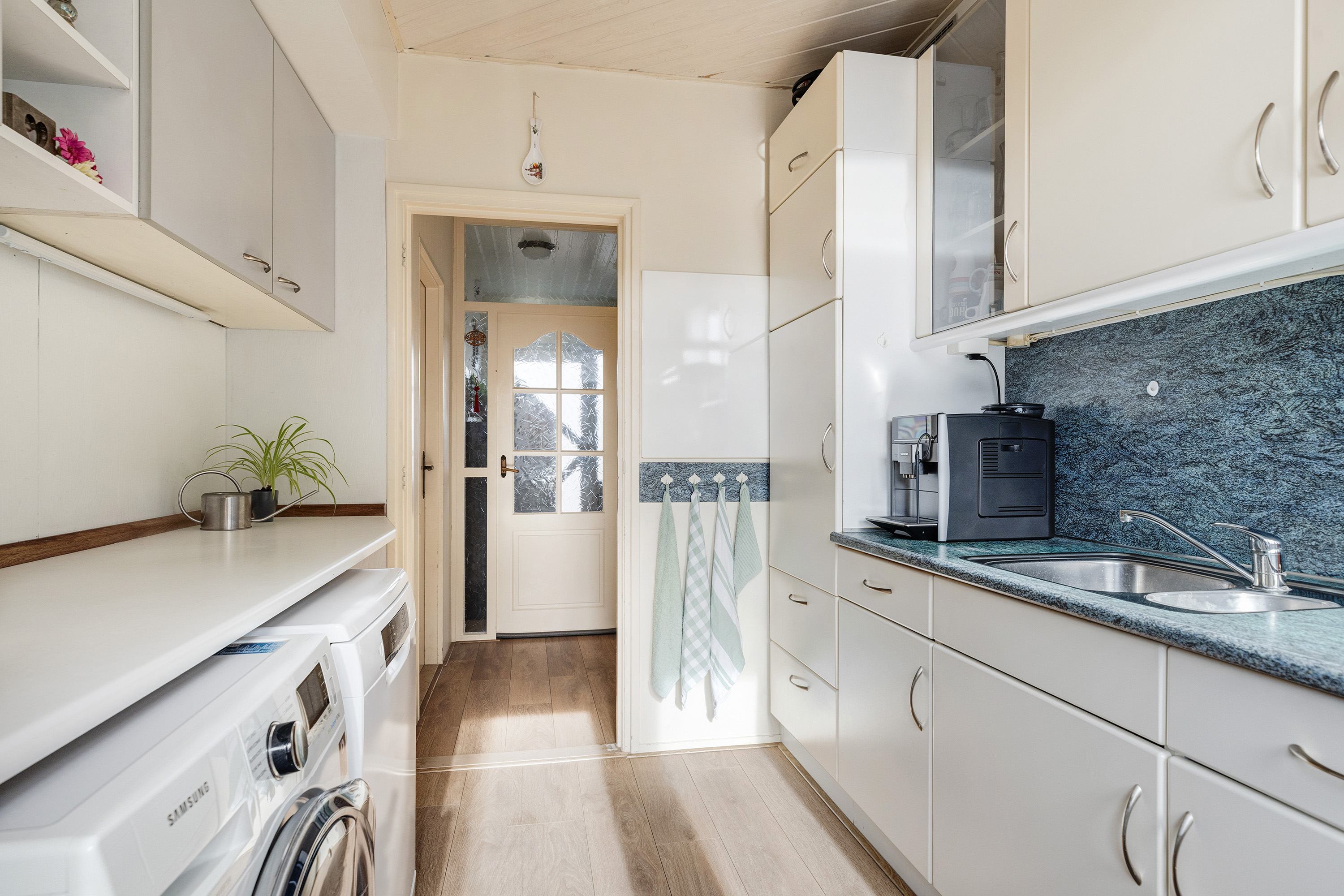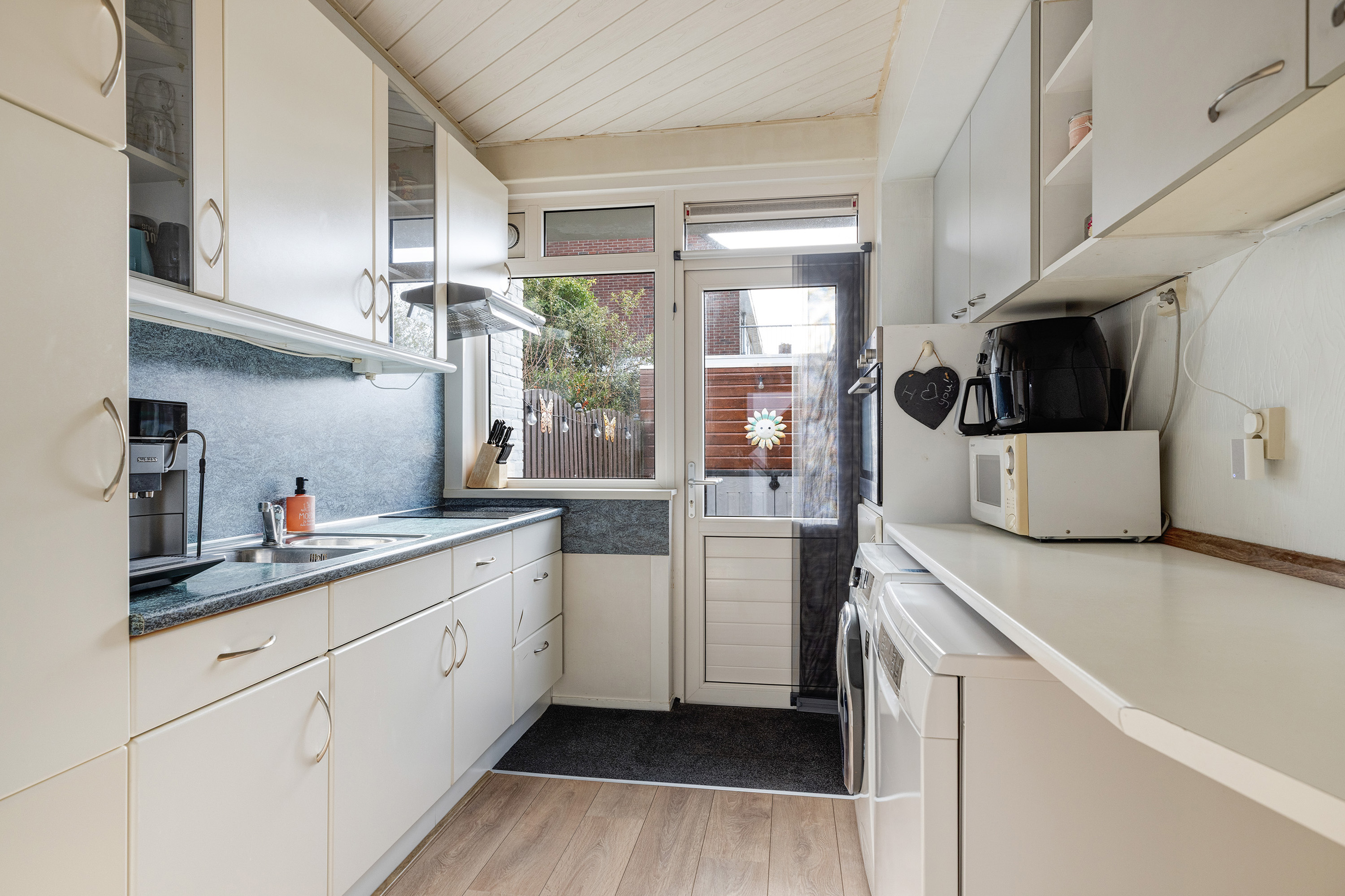 De keuken bevindt zich aan de tuinzijde en is vanuit de hal toegankelijk en heeft een deur naar de achtertuin. De keuken is uitgevoerd in een crèmekleurige opstelling met een kunststof aanrechtblad en beschikt over een koelkast, vriezer, 4-pits inductiekookplaat, 1,5 spoelbak, losse vaatwasser en een wasmachineaansluiting (vaatwasser ter overname). Ook hier ligt een laminaatvloer.