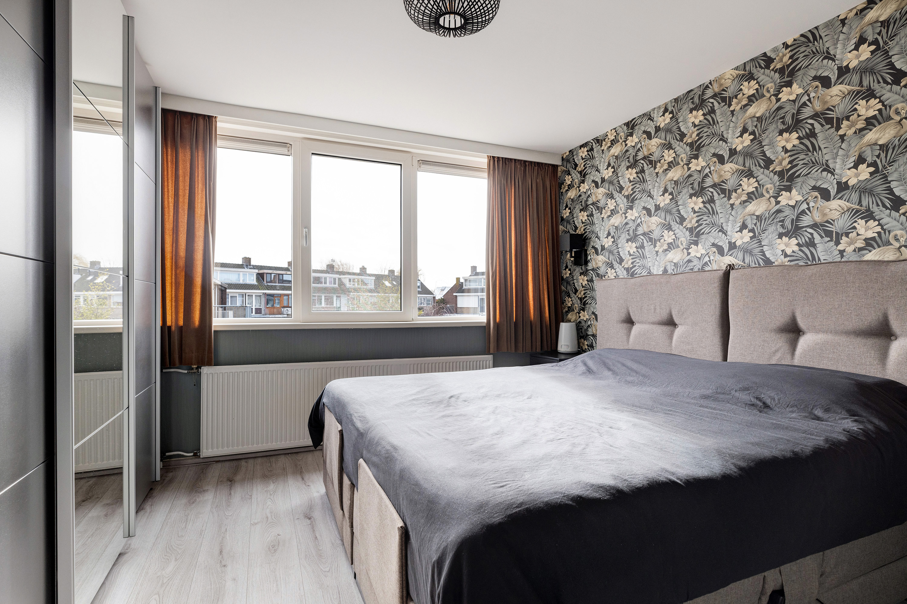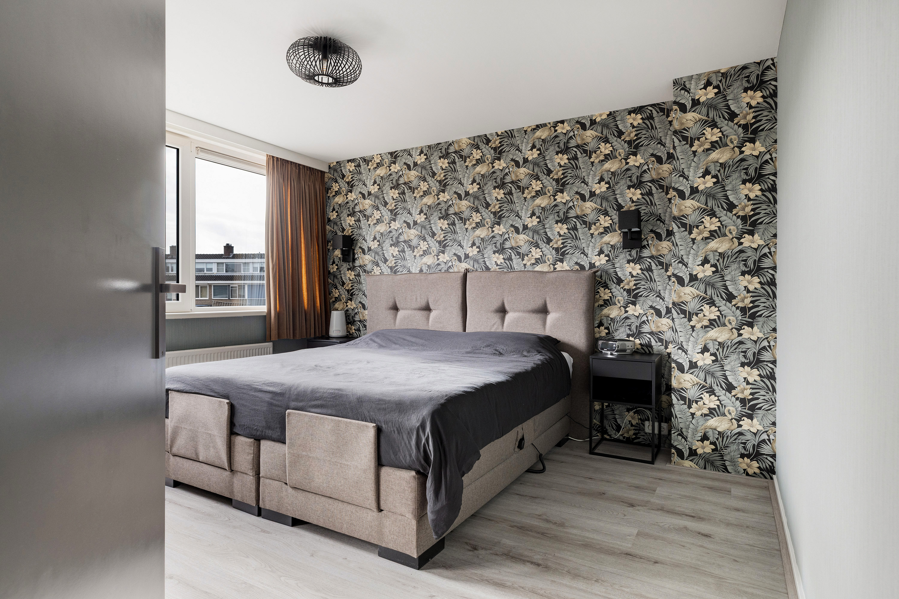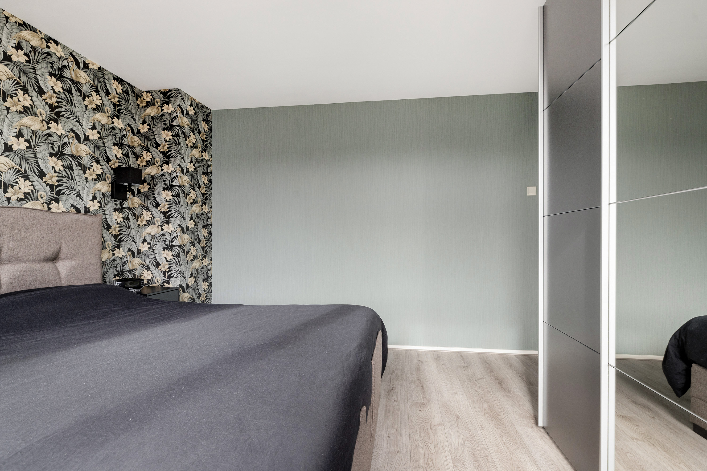 Slaapkamer 1 is gelegen aan de achterzijde en voorzien van een laminaatvloer, behangwanden en een elektrisch bedienbaar zonnescherm.