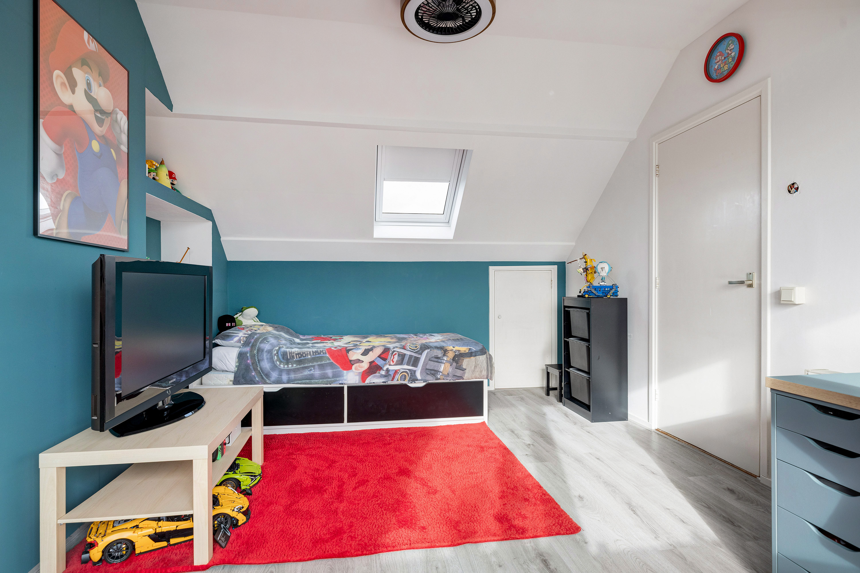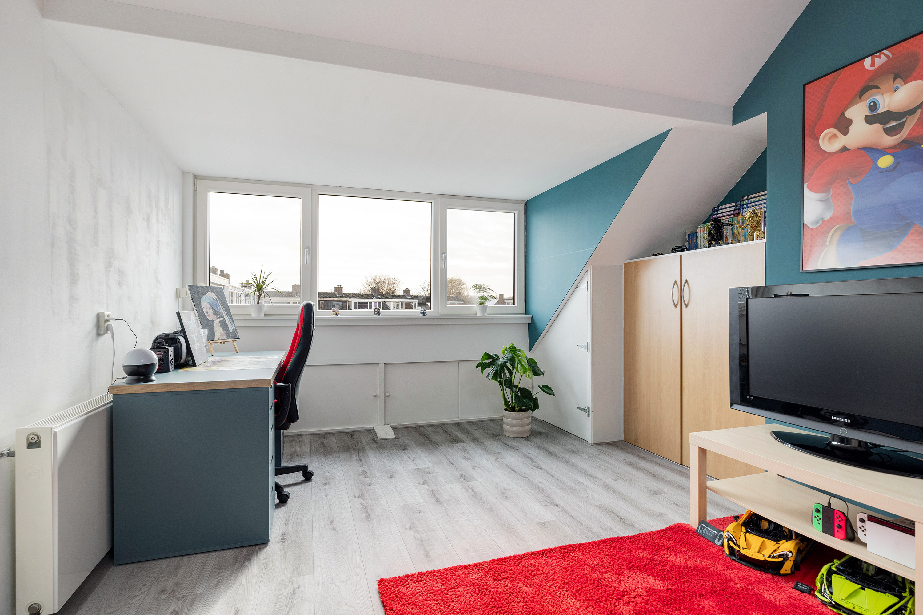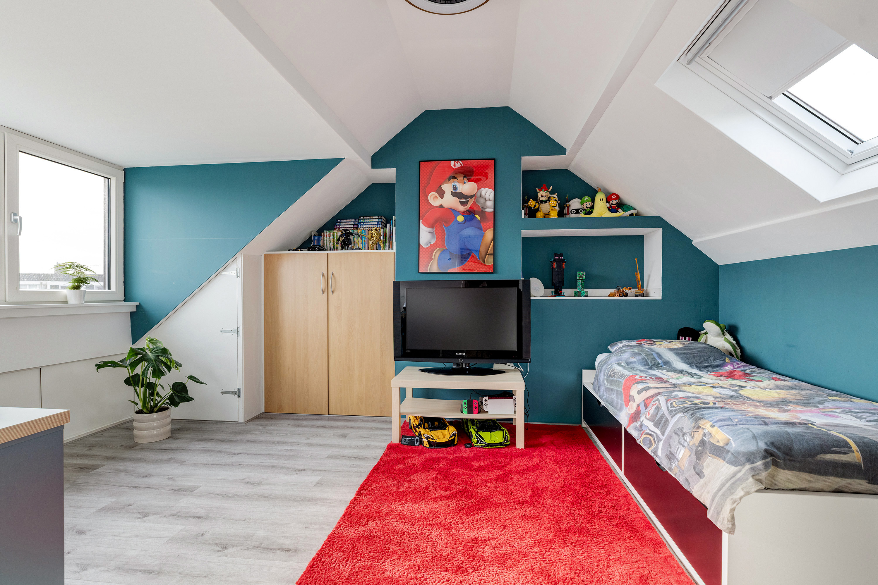 Slaapkamer 4 is een volwaardige en verrassend ruime kamer dankzij de dakkapel aan de achterzijde. Daarnaast is er bergruimte achter de knieschotten aanwezig. Aan de voorzijde bevindt zich een Velux dakraam voor extra daglichttoetreding. De kamer is voorzien van een laminaatvloer en een elektrisch bedienbaar rolluik.