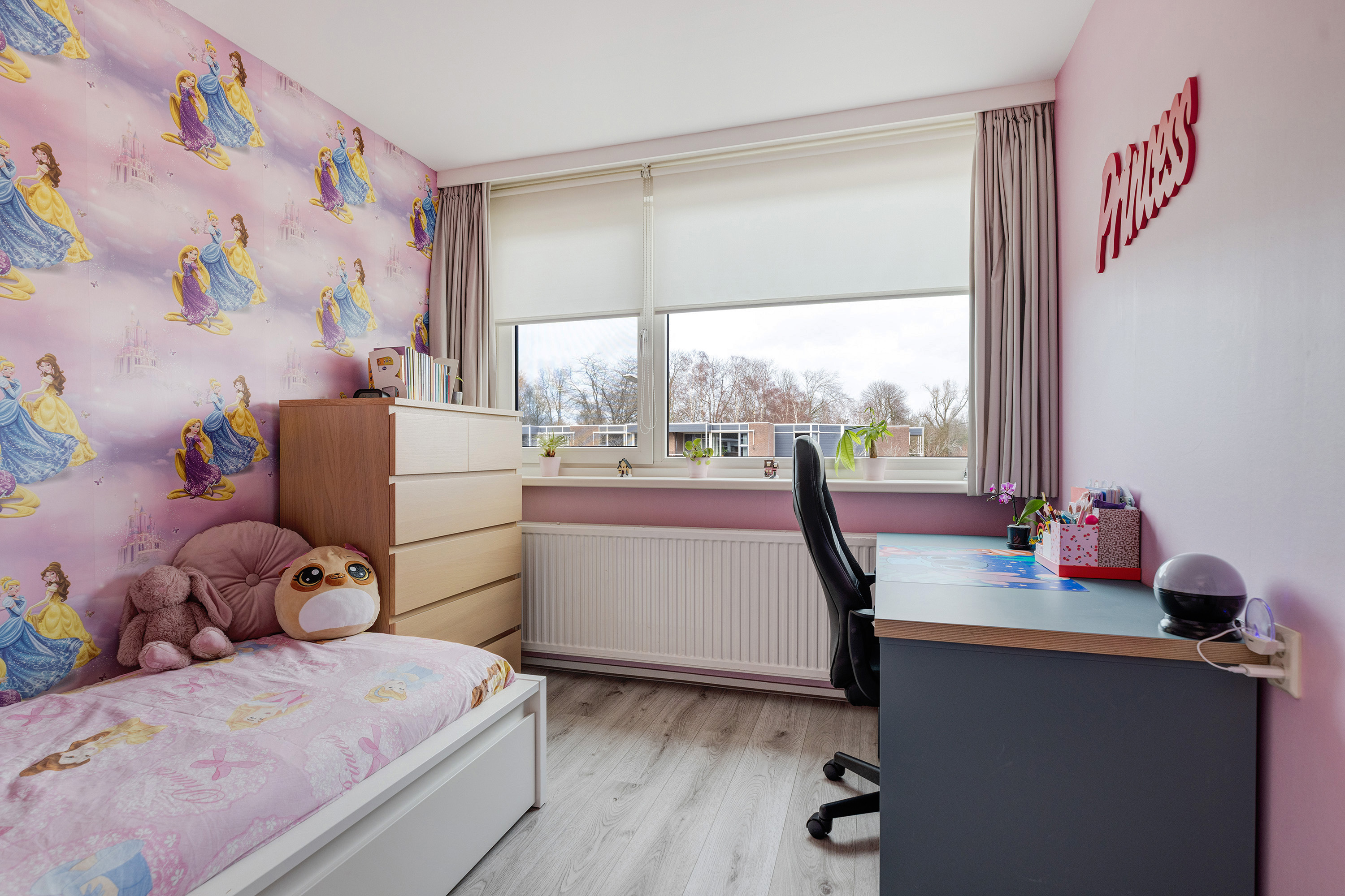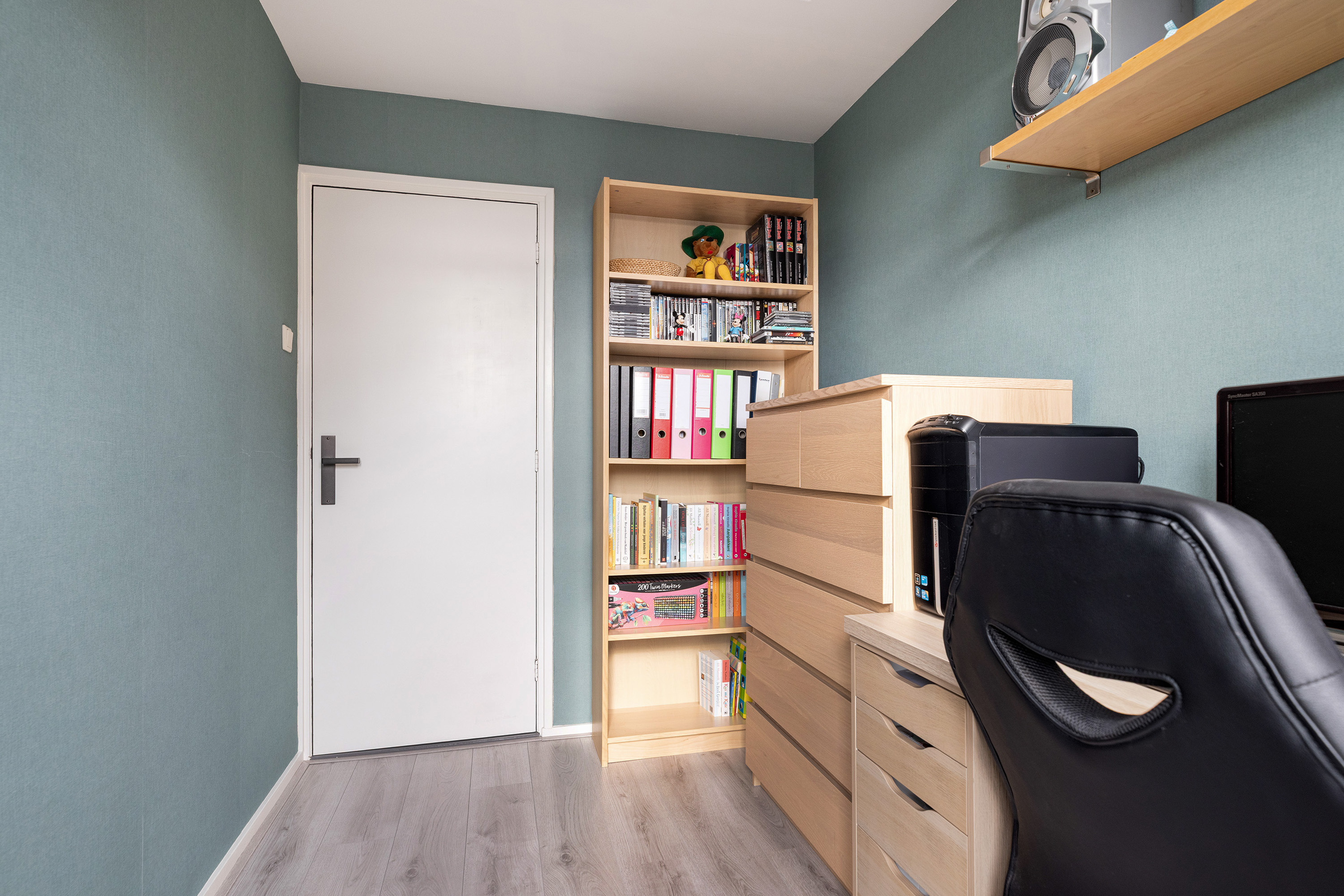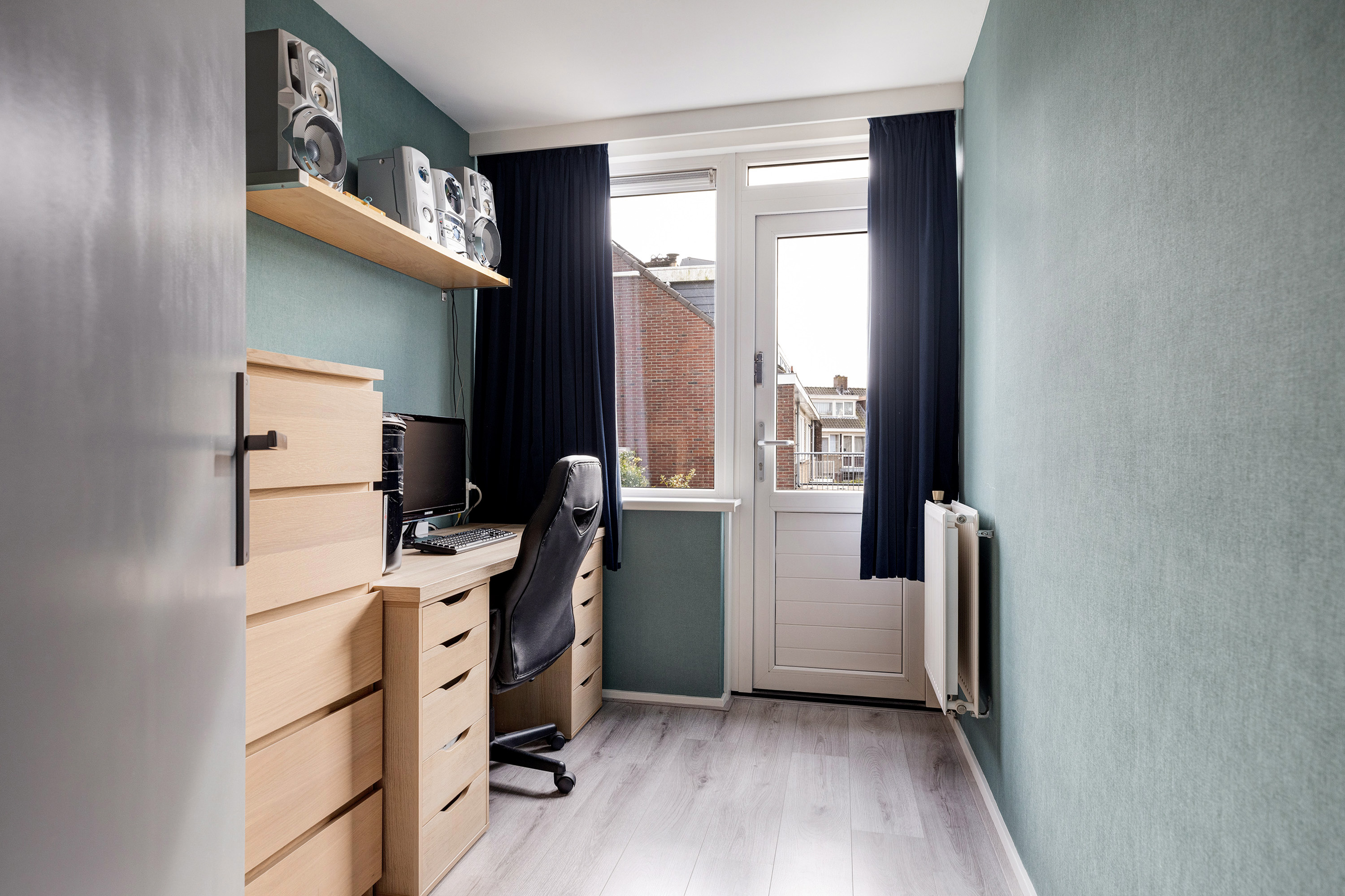 Slaapkamer 4 is een volwaardige en verrassend ruime kamer dankzij de dakkapel aan de achterzijde. Daarnaast is er bergruimte achter de knieschotten aanwezig. Aan de voorzijde bevindt zich een Velux dakraam voor extra daglichttoetreding. De kamer is voorzien van een laminaatvloer en een elektrisch bedienbaar rolluik.
