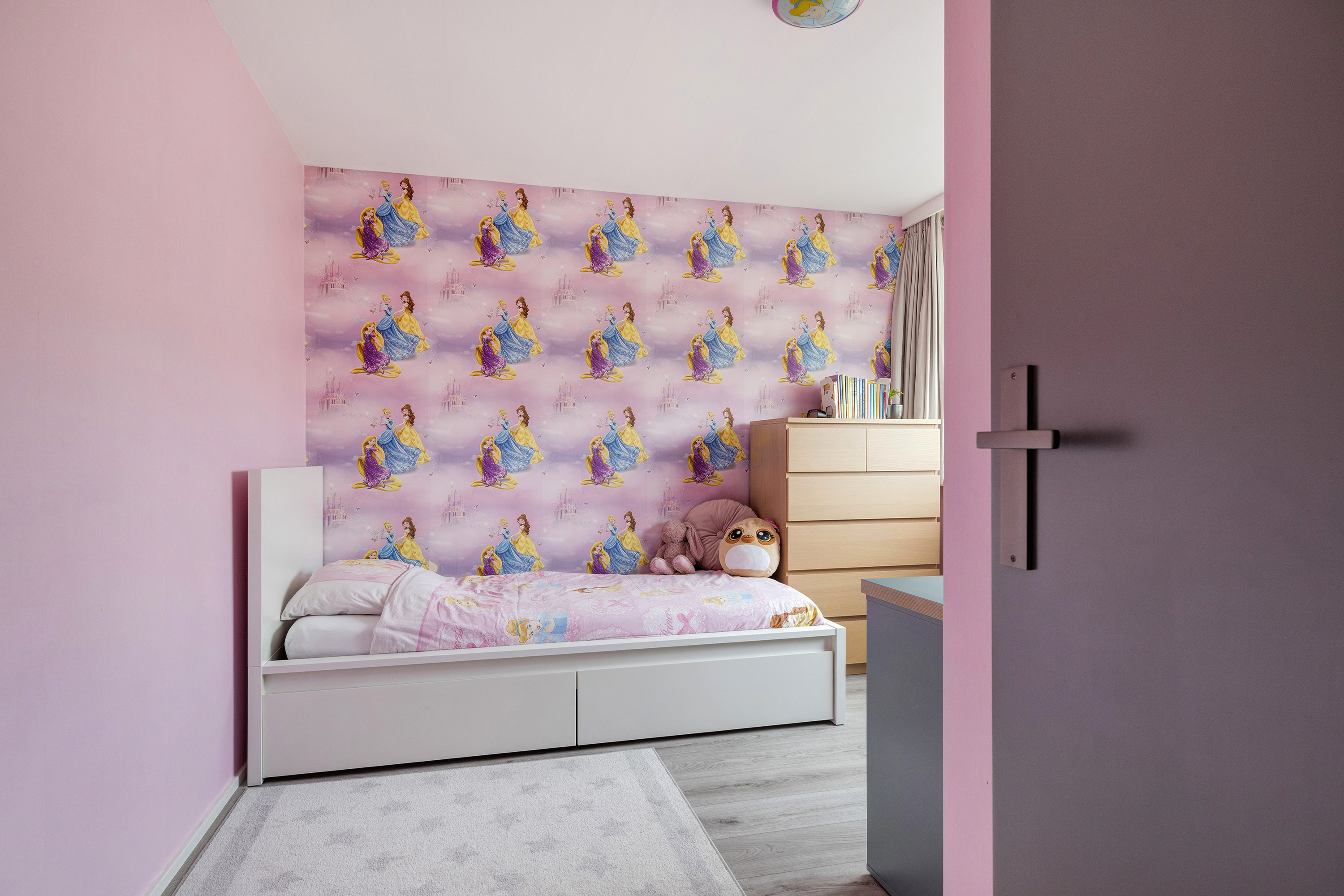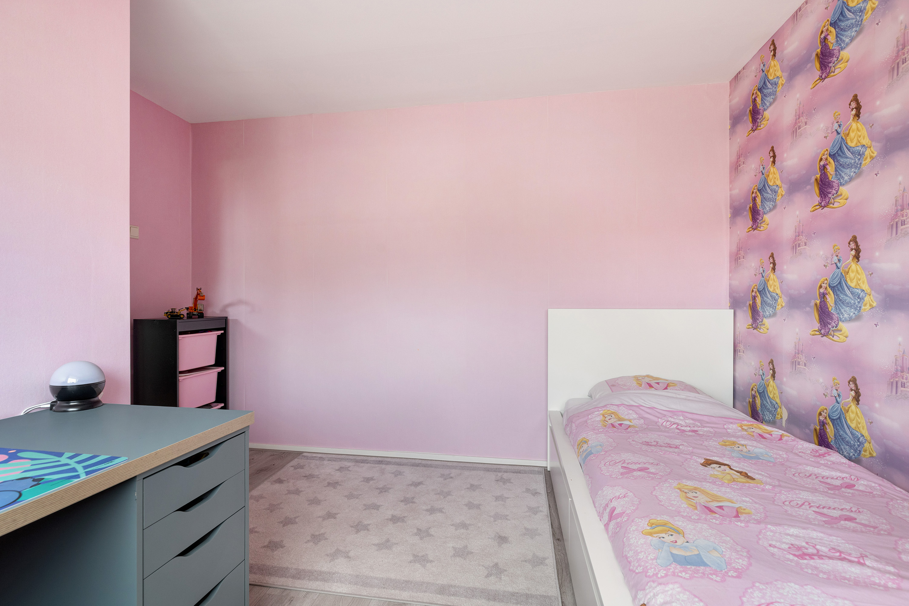 Slaapkamer 2, eveneens aan de achterzijde, beschikt over een laminaatvloer en behangwanden en biedt toegang tot het balkon, een fijne plek om ’s ochtends in alle rust van een kop koffie te genieten.