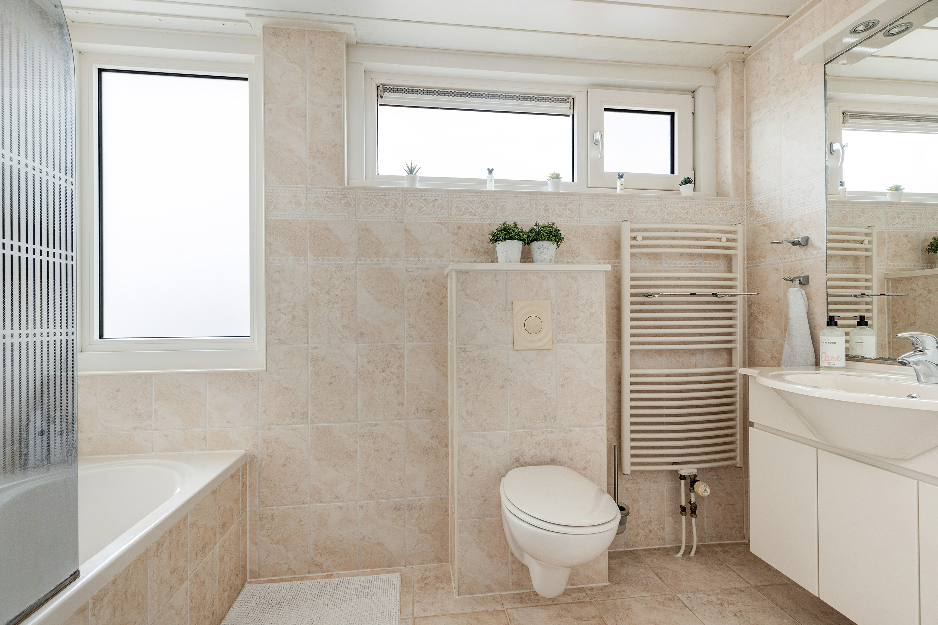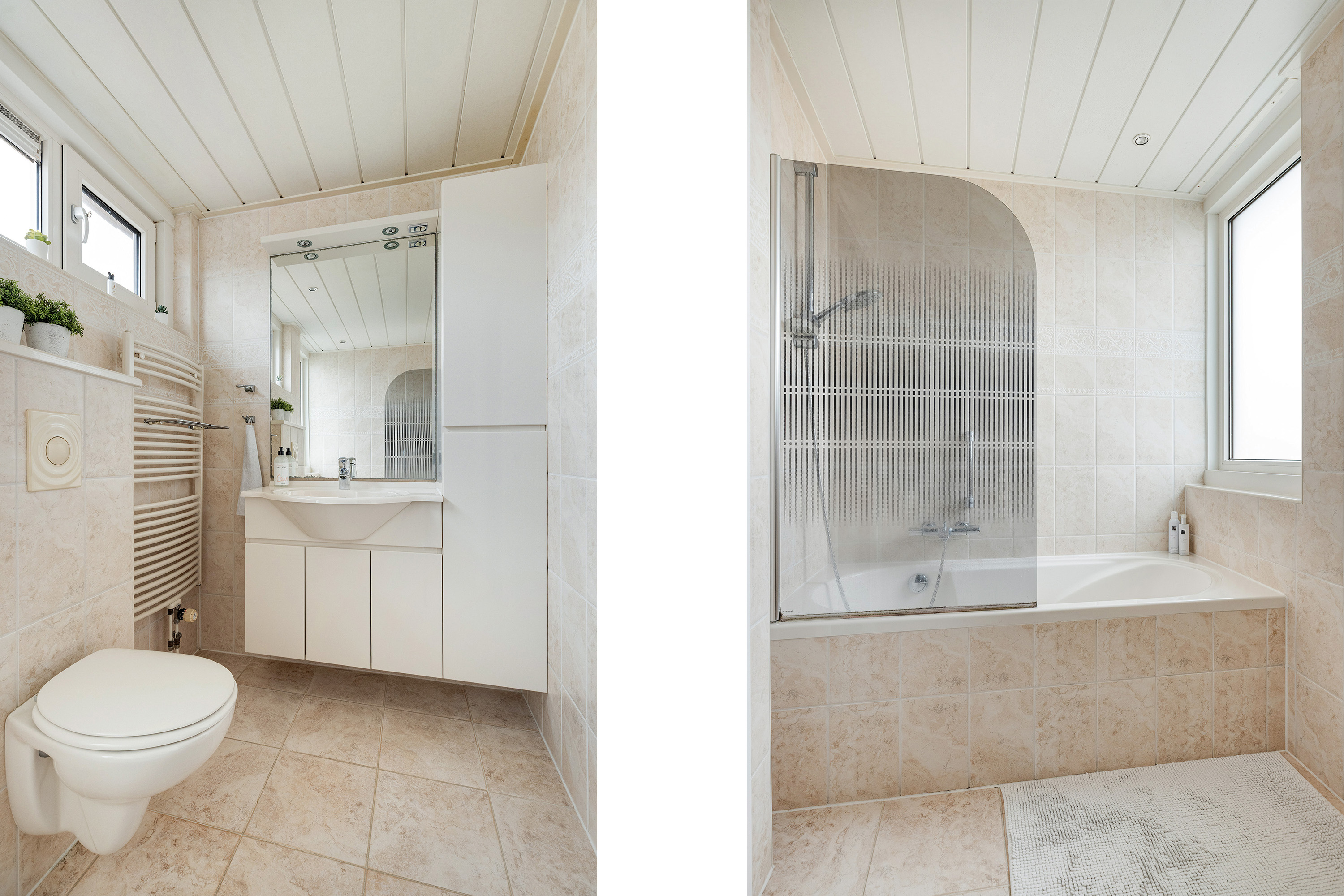 De badkamer is geheel licht betegeld en compleet uitgevoerd met een ligbad voorzien van glazen douchewand, een wastafelmeubel en een tweede, hangend toilet.