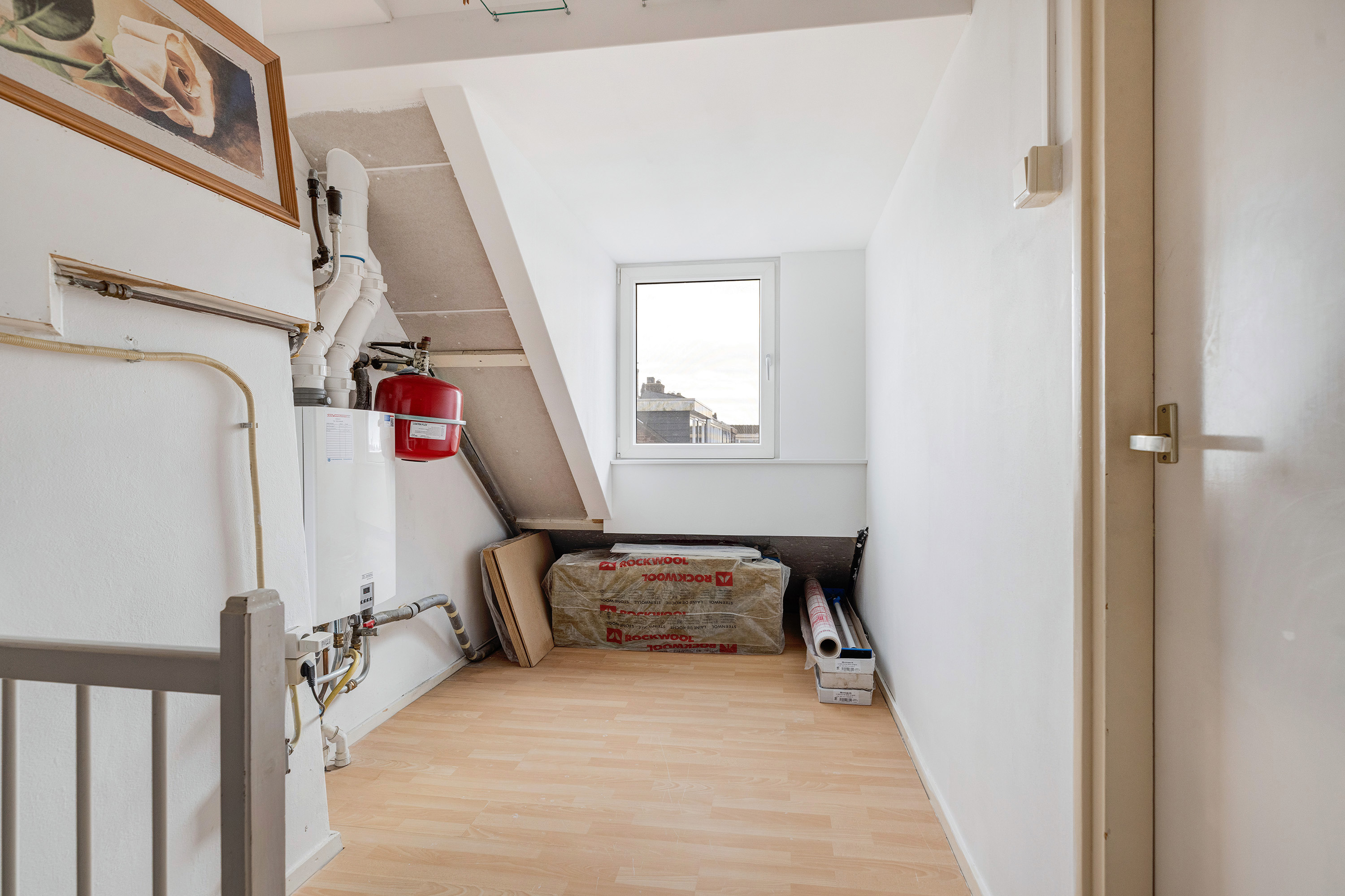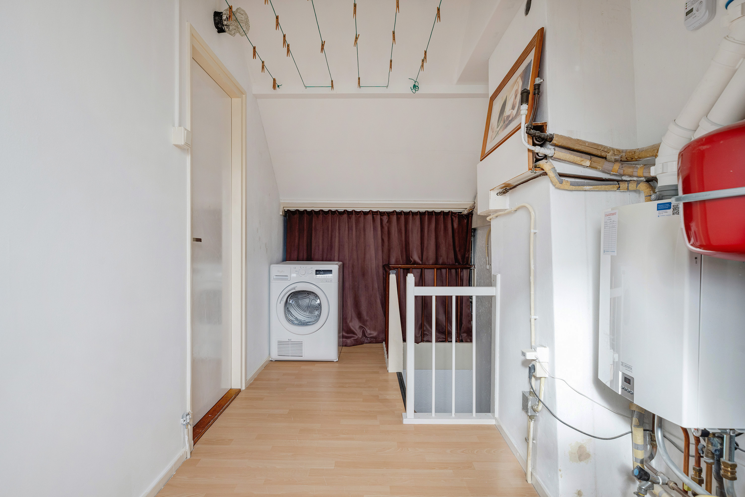 Overloop met opstelplaats voor de cv-installatie, drogeraansluiting en bergruimte onder het schuine dak. Een dakkapel aan de achterzijde zorgt voor extra lichtinval.
