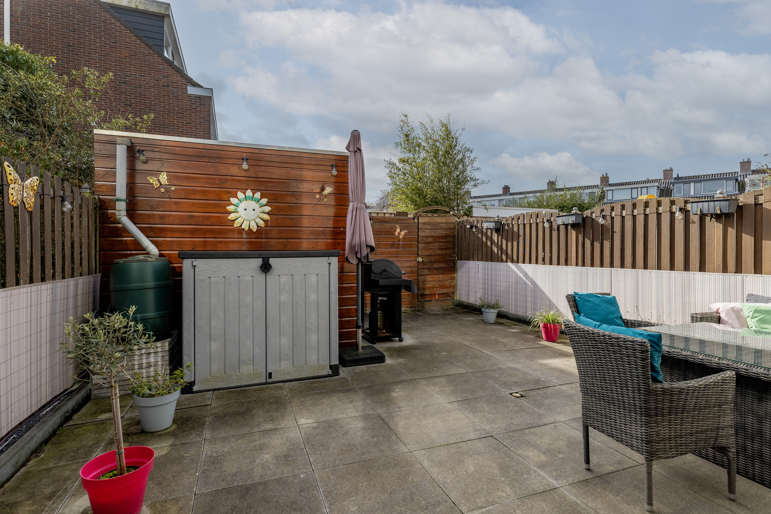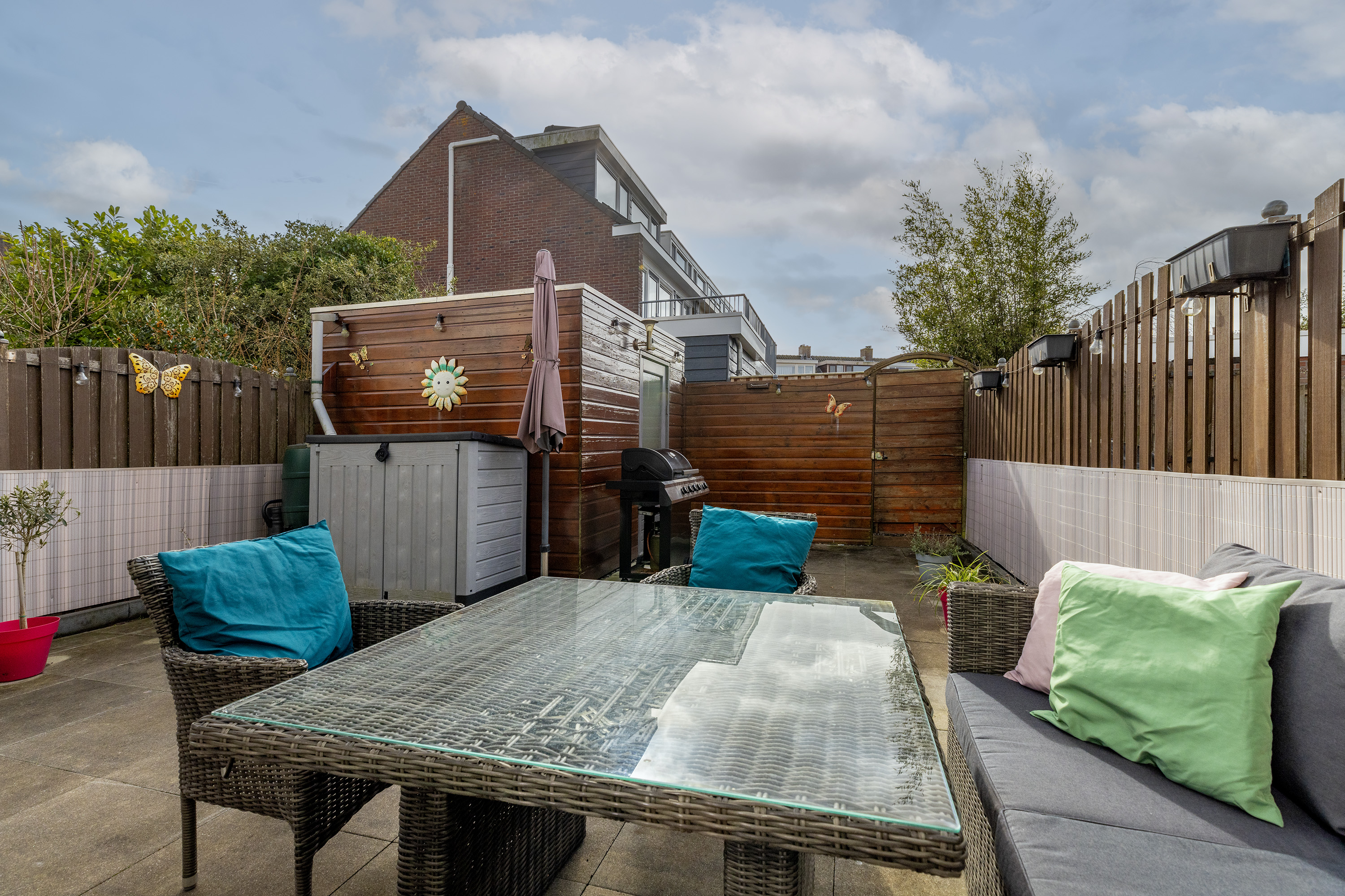 De zonnige achtertuin is gelegen op het zuiden, waardoor u vrijwel de hele dag van de zon kunt genieten. De tuin is voorzien van een handmatig bedienbaar zonnescherm en een praktische houten berging.